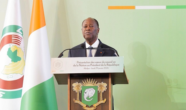 Le président de la République de Côte d'Ivoire, Alassane Ouattara, a échangé ses vœux du Nouvel An 2026 avec les corps constitués et les forces vives de la nation, lors d’une cérémonie tenue ce jeudi 29 janvier 2026 au Palais de la Présidence.